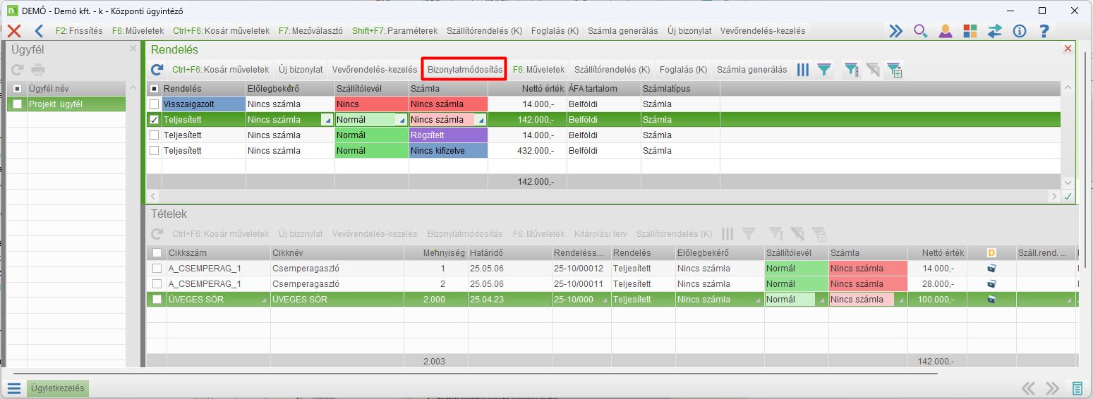 Az eddig ismertetett Bizonylatmódosítás arra szolgált, hogy egy meglévő bizonylatcsokrot (rendelés+szállítólevél+számla) egyszerre tudjon módosítani a felhasználó, fel tudjon venni új tételeket, vagy meglévőket tudjon módosítani. Viszont ez a művelet nem volt alkalmas arra, hogy a folyamatban előrébb tegye az adott bizonylatot.