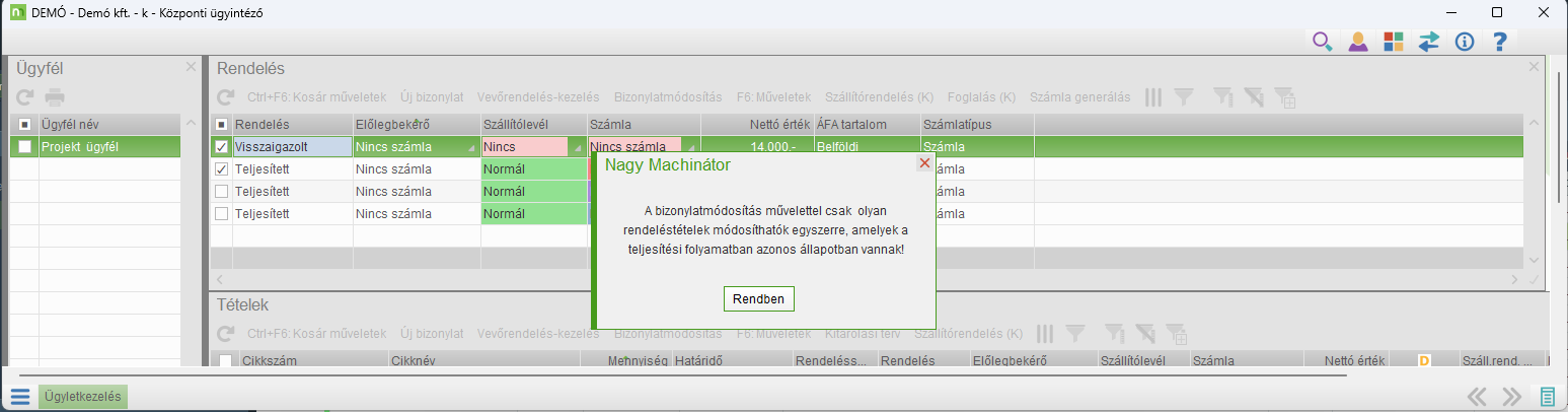 Vegyes állapotban lévő tételeket egyszerre nem lehet módosítani.