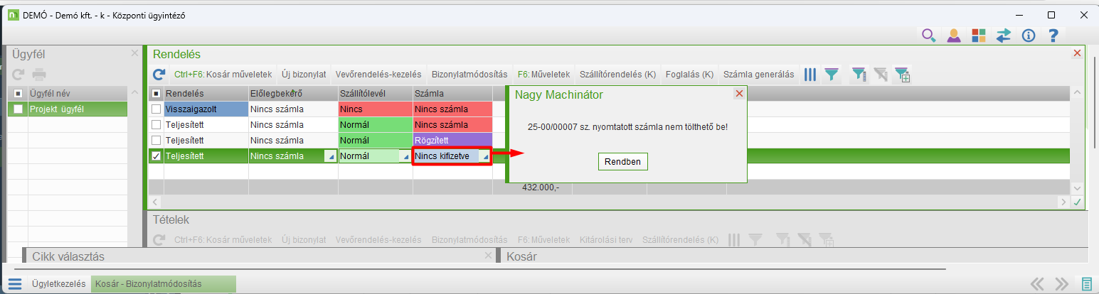 A program attól függő módon fogja a Kosarat módosítás üzemmódban elindítani, hogy a kiválasztott bizonylat milyen állapotban van.