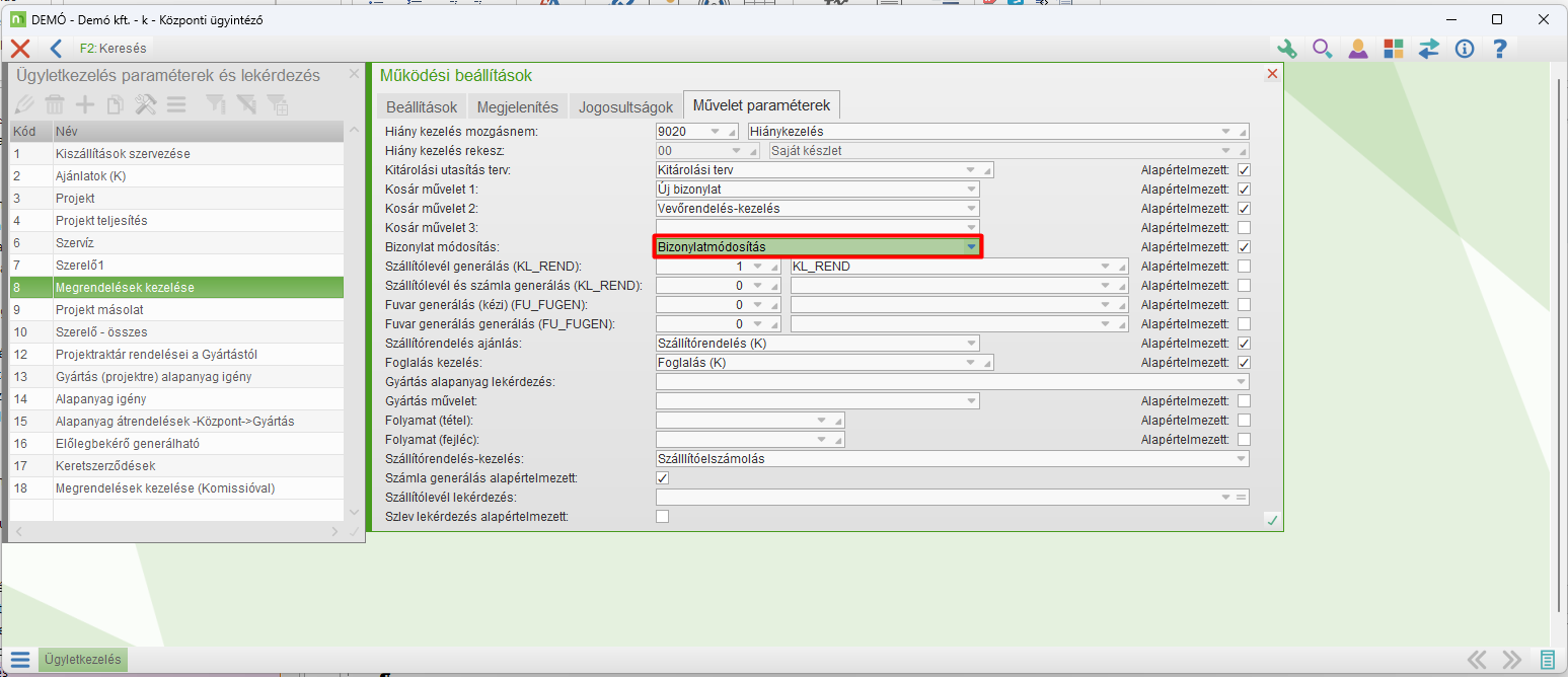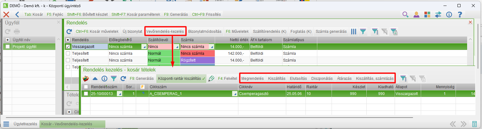 A vevőrendelések állapotának változtatására szolgál a Vevőrendelés-kezelés művelet.