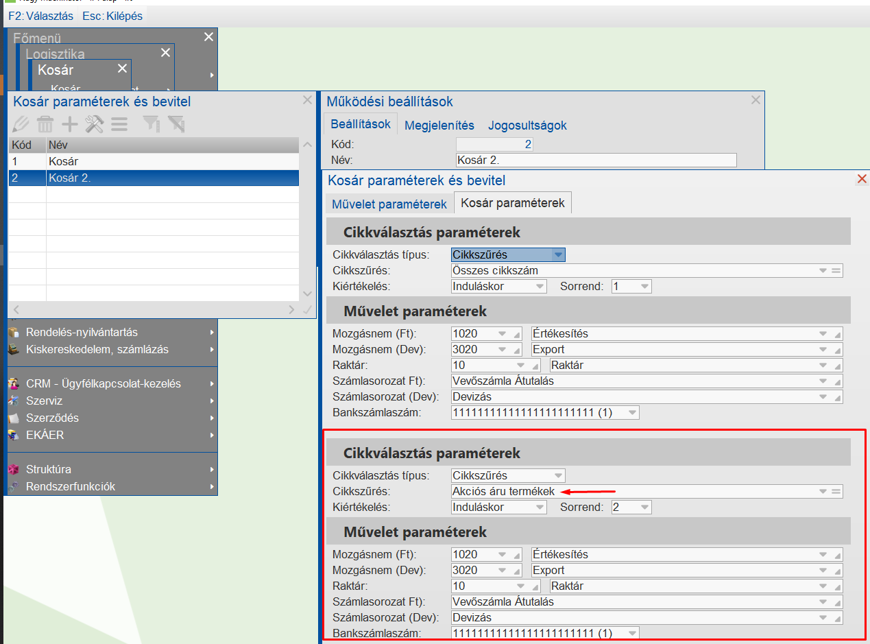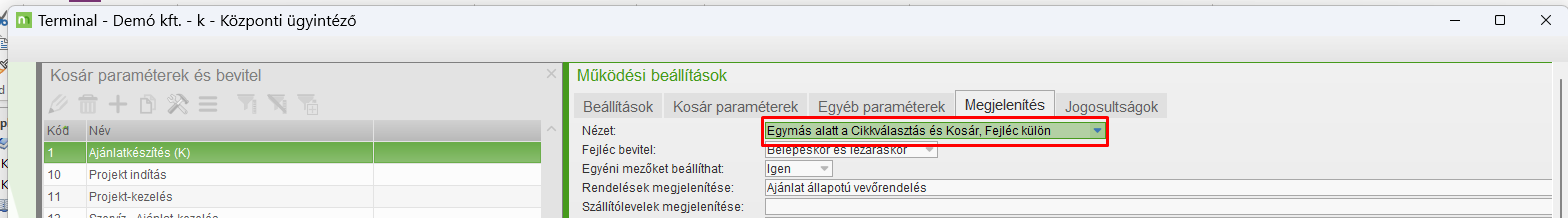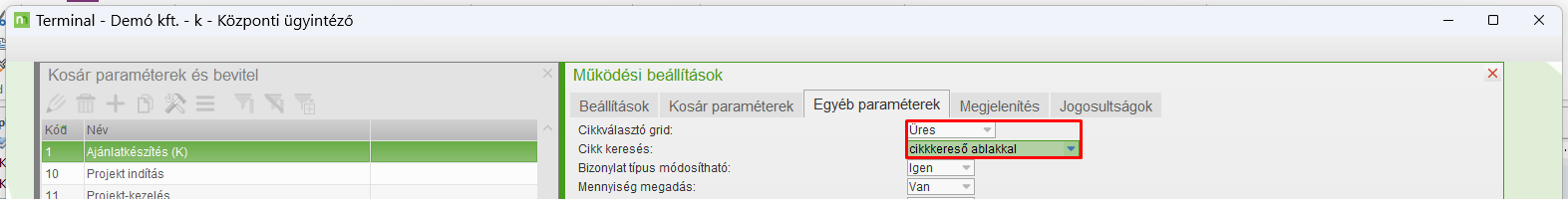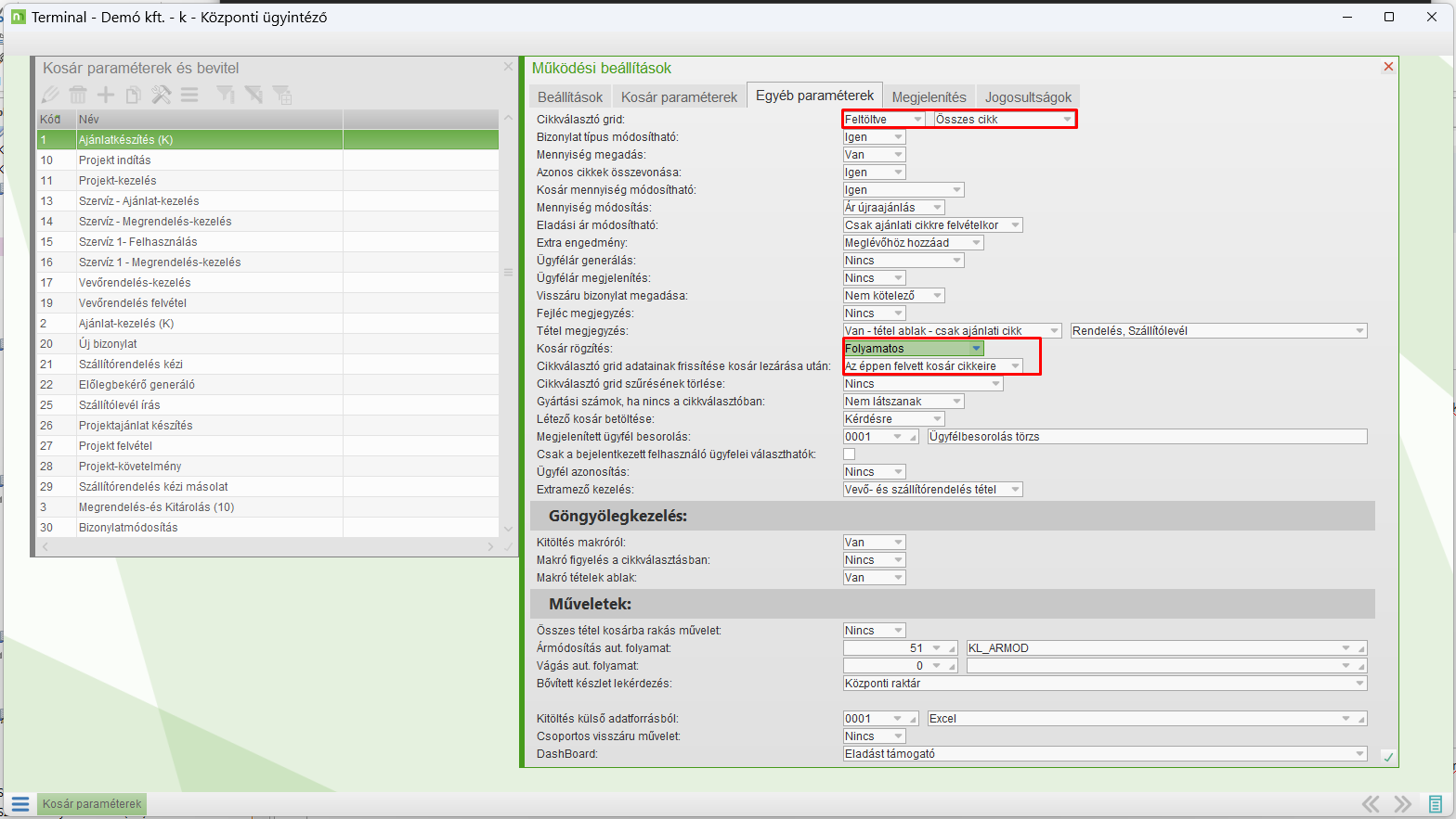 Akinek az indítással töltött idő elfogadható, azt ajánljuk, hogy állítsa be a Kosár paraméterekben, hogy folyamatos legyen a kosár, vagyis az egyes bizonylatok elkészítése után ne lépjen ki, ezzel biztosítva, hogy csak egyszer kellett kivárni a cikk választó feltöltését.