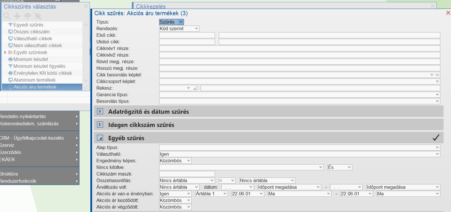 (Például lehet szűrést arra megadni, hogy csak azokat a cikkeket kérem, ahol a kiadható készlet nagyobb mint 0.)
