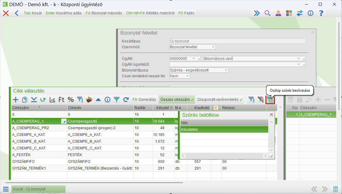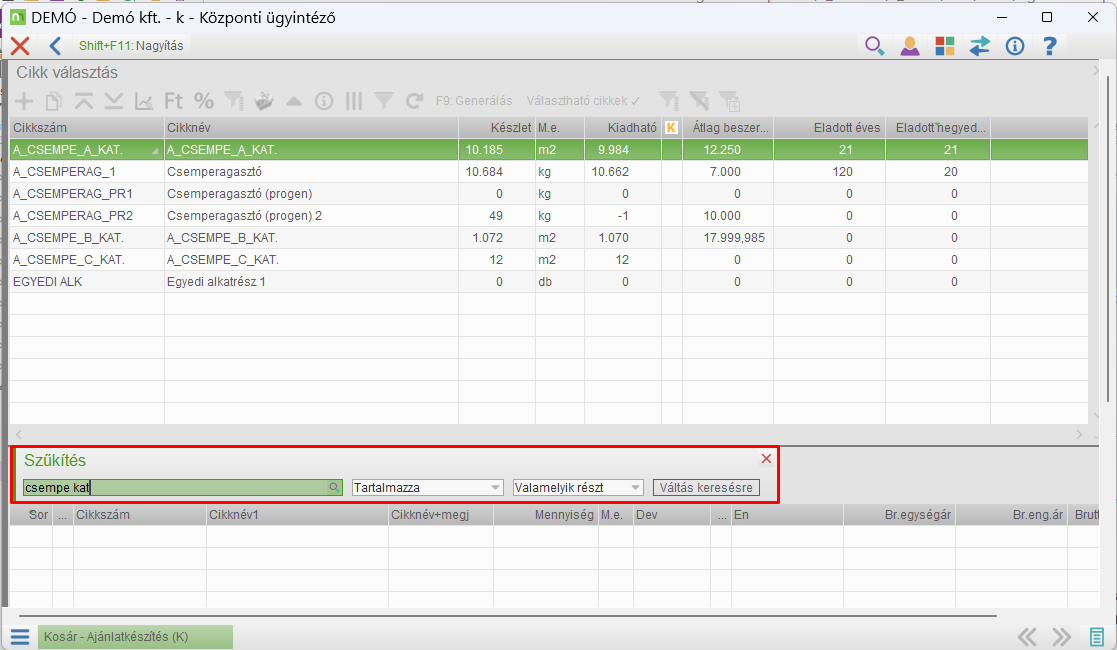 A Kosár funkció a használat során fel fogja tölteni a Cikk választás ablakot, amelyben a felhasználó nagy rugalmassággal tud keresét végrehajtani.