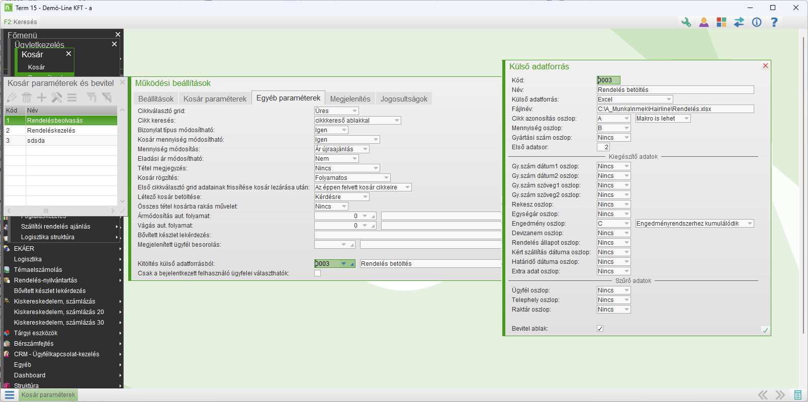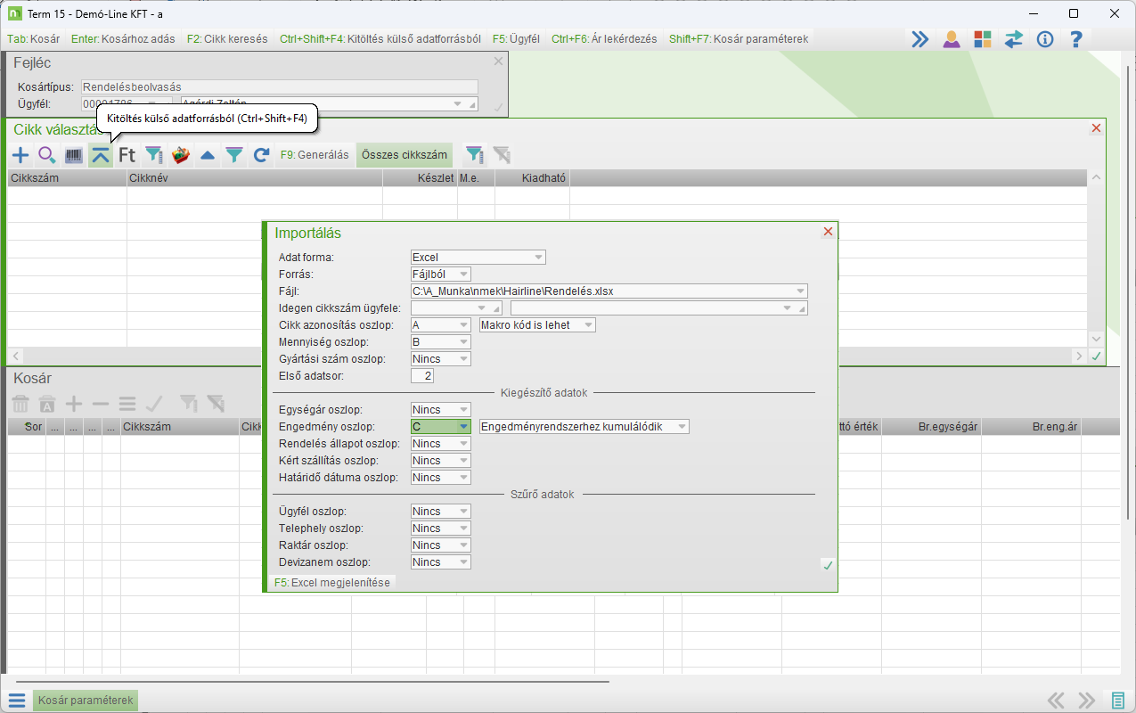 A Kosár funkcióban vevőrendelést külső adatforrás alapján is fel lehet rögzíteni.