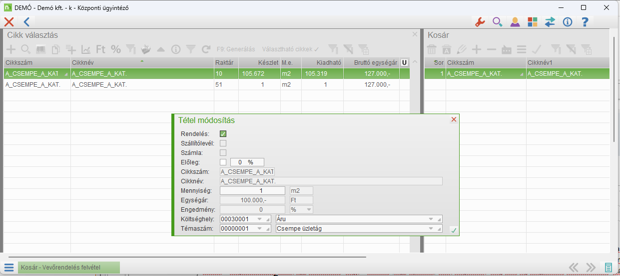 A Kosárban lévő tételek módosításának módjára vonatkozó beállítási lehetőség. Gridben A tételmódosítása a Kosár gridjében történik a tétel kiválasztása után. Külön ablakban A tételmódosítása egy külön ablakban történik a tétel kiválasztása után |