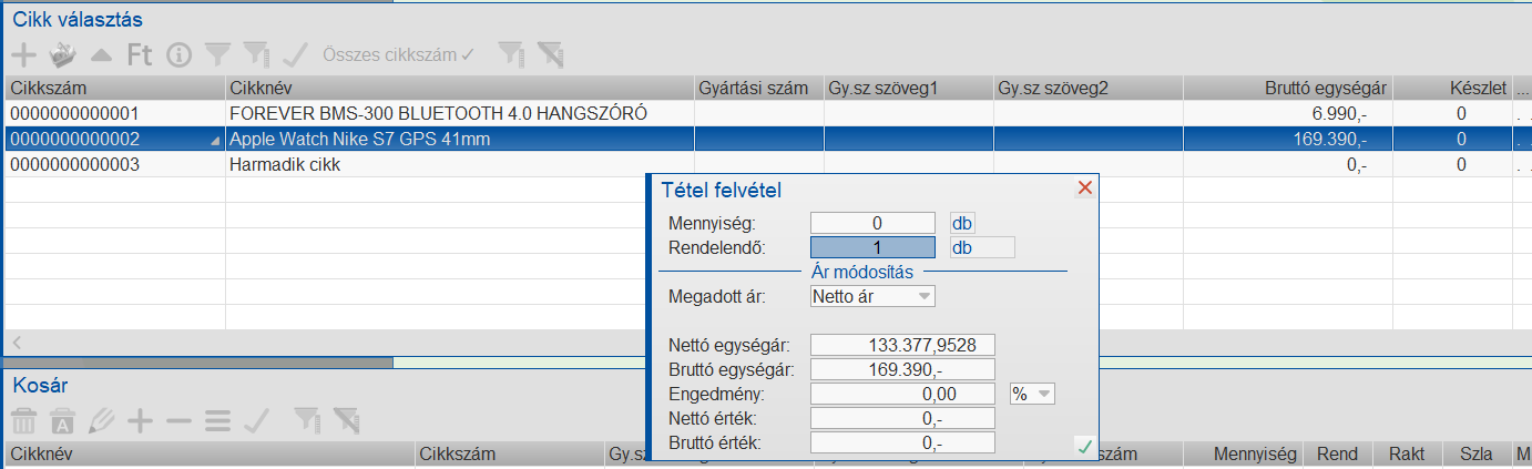 A kosár alapműködése szerint a gyártási számos termékek gyártási számonként jelennek meg a cikkválasztó ablakban.