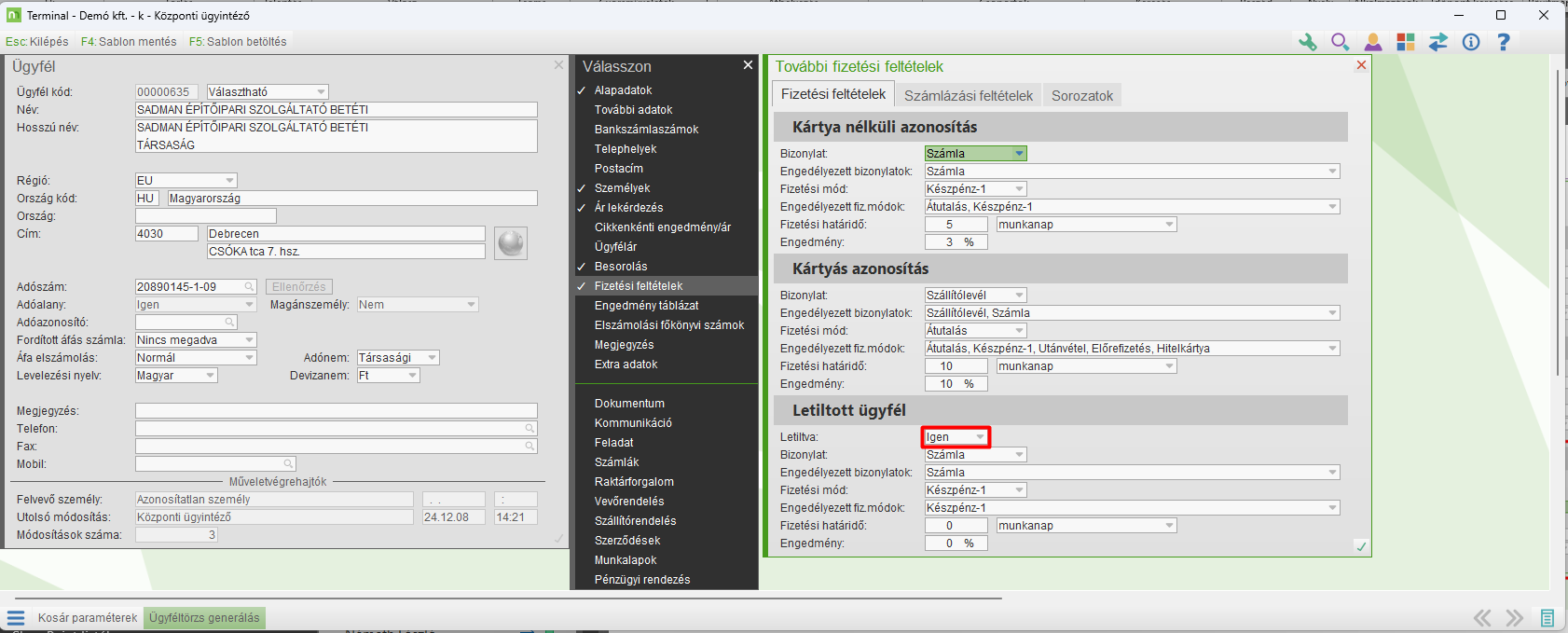 Az alábbi képen látható beállítás egy várható alkalmazását mutatja a letiltásnak. Nagy valószínűséggel mondható, hogy a letiltott ügyfél csak számlára és készpénzre kaphat majd árut, és kedvezményt sem fog kapni rájuk.