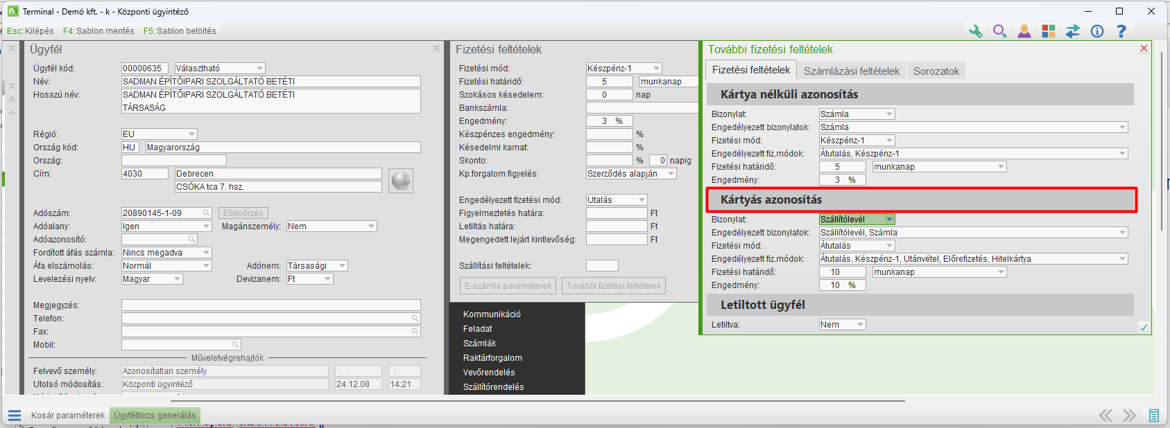 Vásárlóazonosítás szerinti fizetési és számlázási feltételek kezelése |