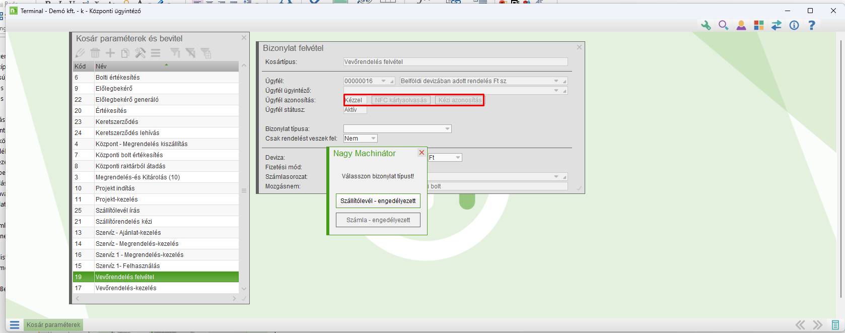 Az alábbi képből például az olvasható ki, hogy az ügyfelet kézzel (személyesen) azonosították, ami után számla mellett szállítólevélre is elviheti árut.