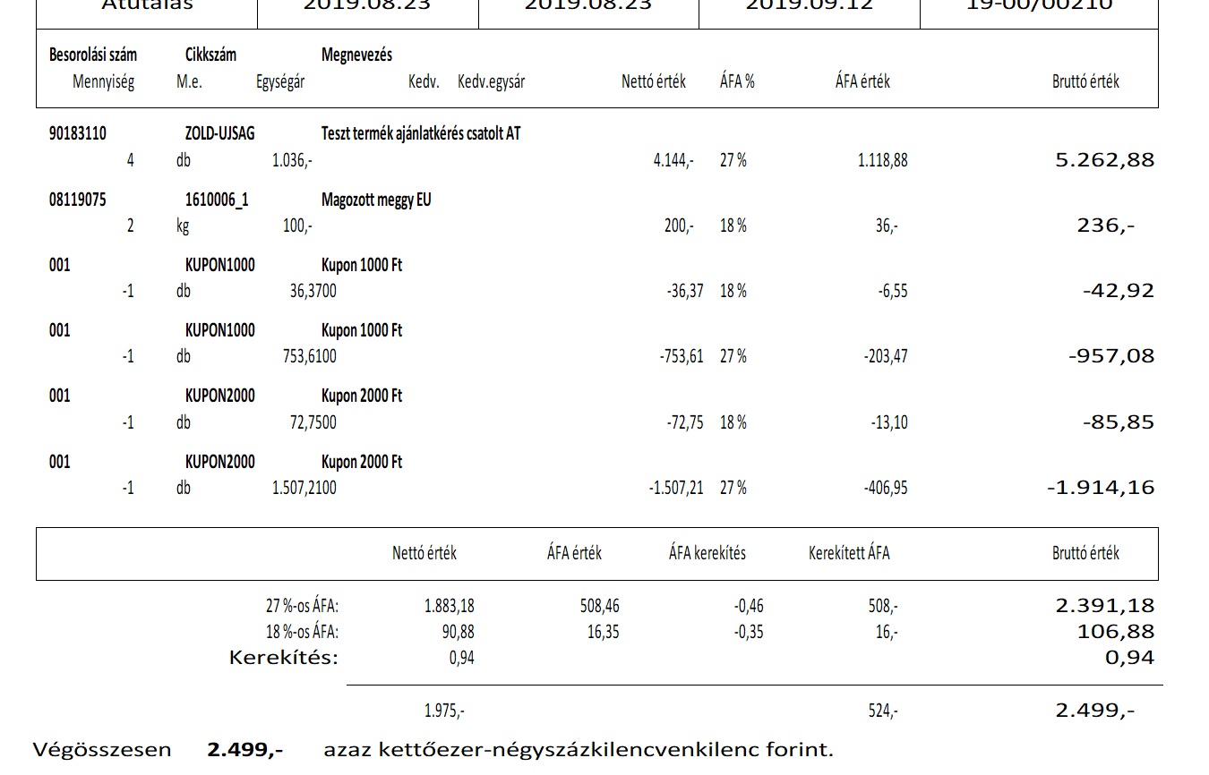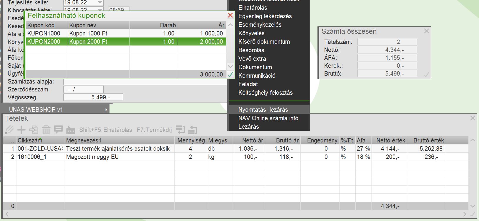 A számla nyomtatása (Nyomtatás, lezárás) közben választható kuponok külön tételként kerülnek a számlára, negatív mennyiséggel (és így értékkel).