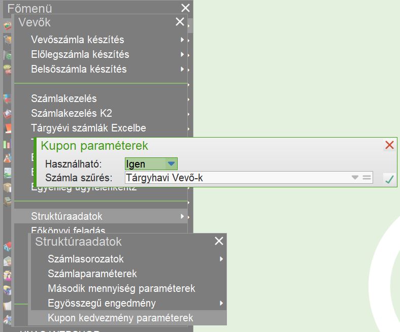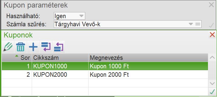 A funkcióval előre rögzített kuponkedvezmények adhatók, melyek a számla fizetendő összegét csökkentik. Akár a vevőszámla, akár a kiskereskedelem modulban készített számláknál használható a kedvezmény (az export számláknál jelenleg nem).