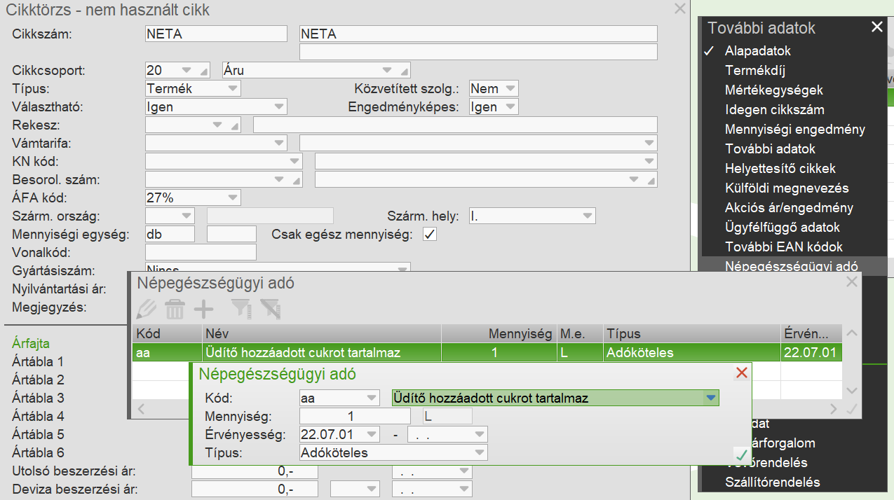 A cikktörzsben a Népegészségügyi adó almenüpontban lehet cikkenként megadni, hogy melyik adókód érvényes a termékre.