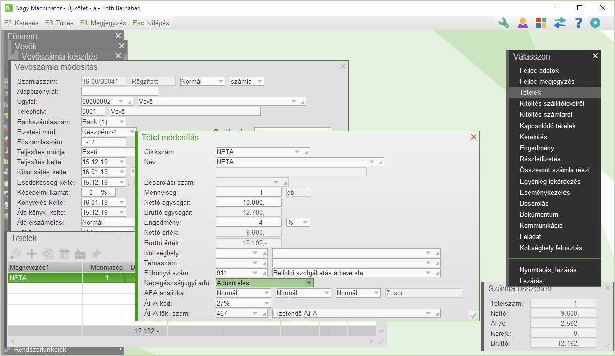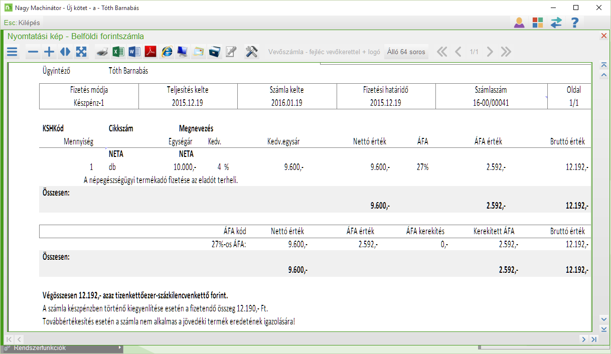 A kinyomtatott számla tételesen fogja tartalmazni a számla tételében beállított értéket.