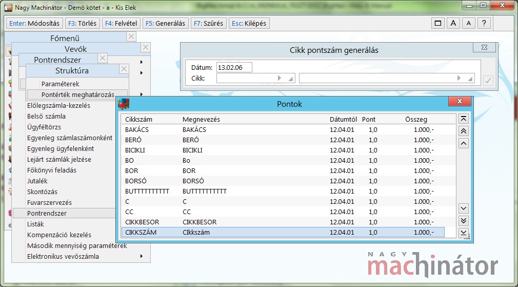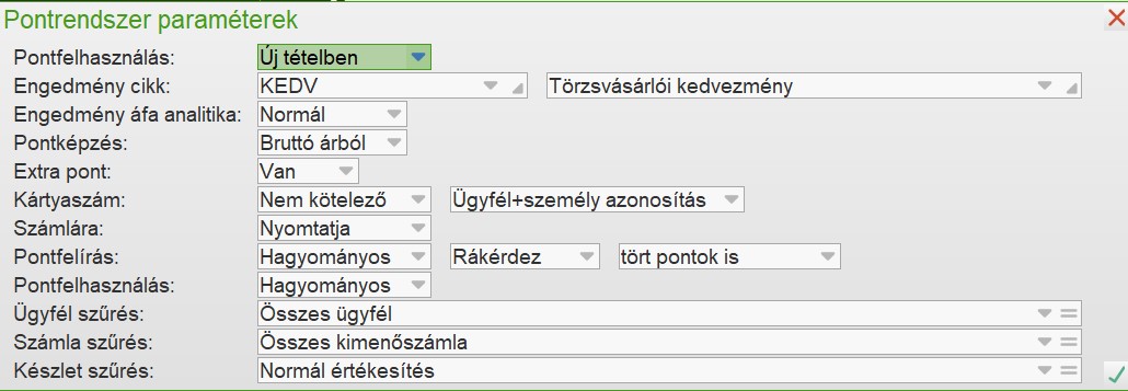 A Pontrendszer paraméterek funkció aktiválja a pontrendszert, továbbá itt lehet meghatározni, hogy milyen számlák esetén adjon pontot a program -> Részletek