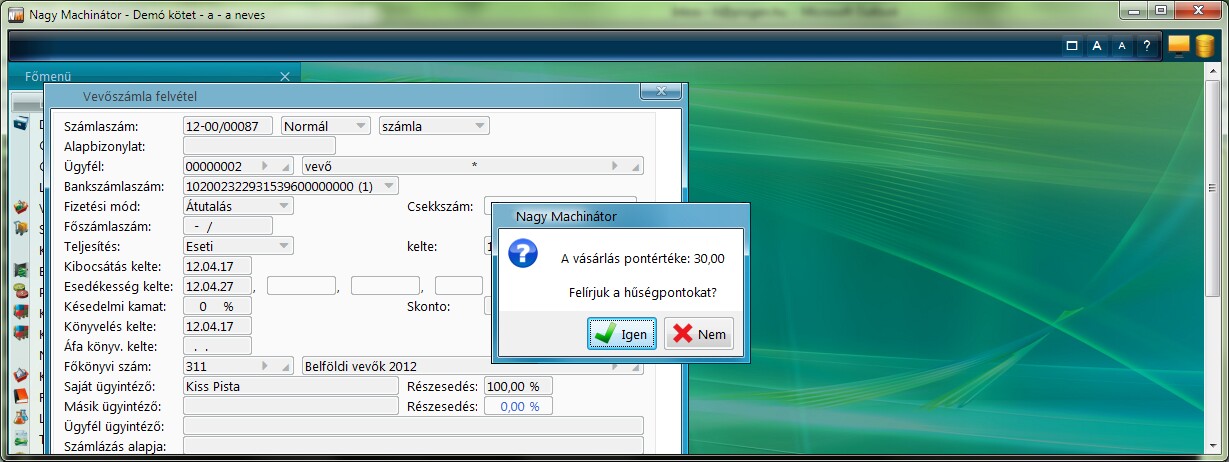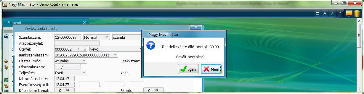 A számla (bolti értékesítés, vevőszámlázás, devizás számlázás) lezárását követően a program kiszámolja az adott számlára vonatkozóan a vásárlás pontértékét és megkérdezi, hogy történjen-e pontfelírás (Pontrendszer paraméterek ablakban meg lehet változtatni a működési módot)