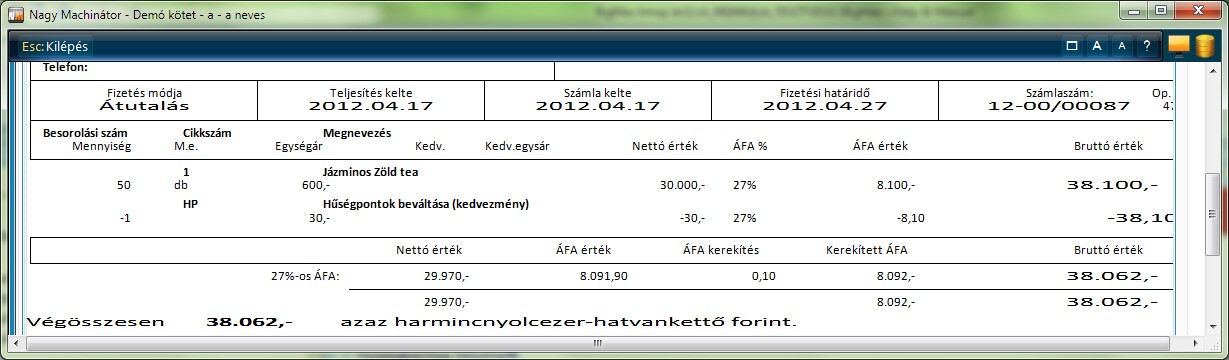 Beváltás esetén a számlán egy külön tételben fog megjelenni a kedvezmény. A kedvezménytétel (amelyet a Pontrendszer paraméterekben kell megadni) lényegében egy cikkszám. A tétel megnevezése ebből adódóan a cikktörzsben megadott megnevezés lesz. (Pontrendszer paraméterek ablakban meg lehet változtatni a működési módot. Be lehet állítani, hogy ne külön tétel legyen, hanem a tételekben legyen szétosztva a kedvezmény. Ebben az esetben az is beállítható, hogy emberi beavatkozással lehessen az egyes pontokat megadni. Továbbá az egy tételhez felhasználható pontok mértékét is be lehet állítani.)