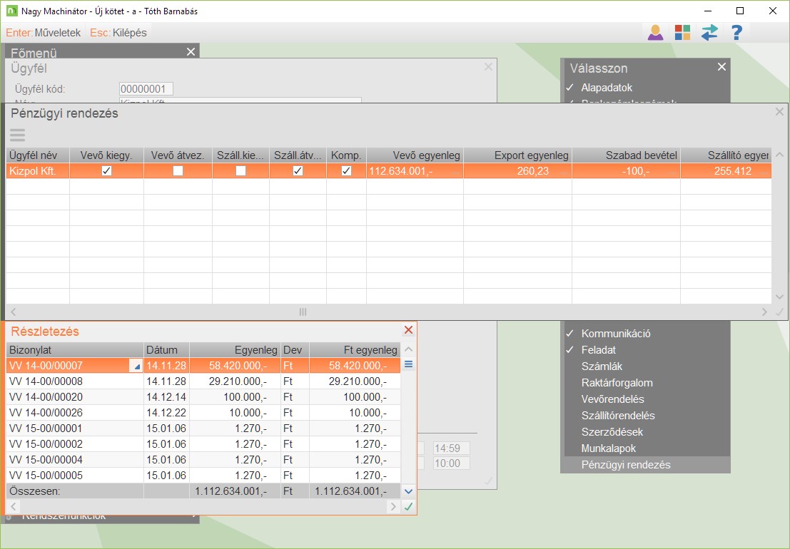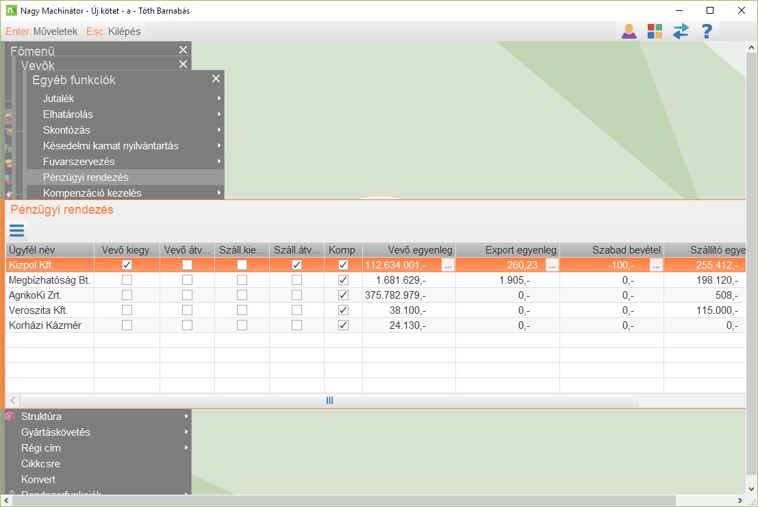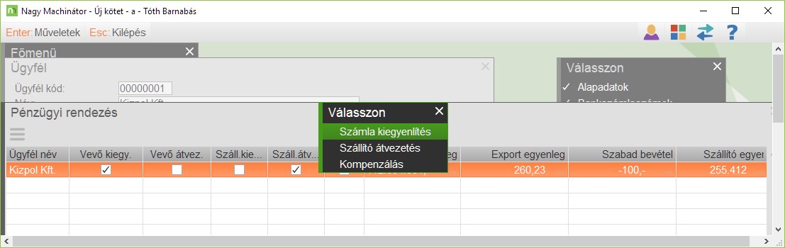 Elindítás után a funkció az érintett ügyfelek szállító, vevő egyenlegét kiszámolja és megkeresi a bankból pénztárból a szabad fizetéseket.