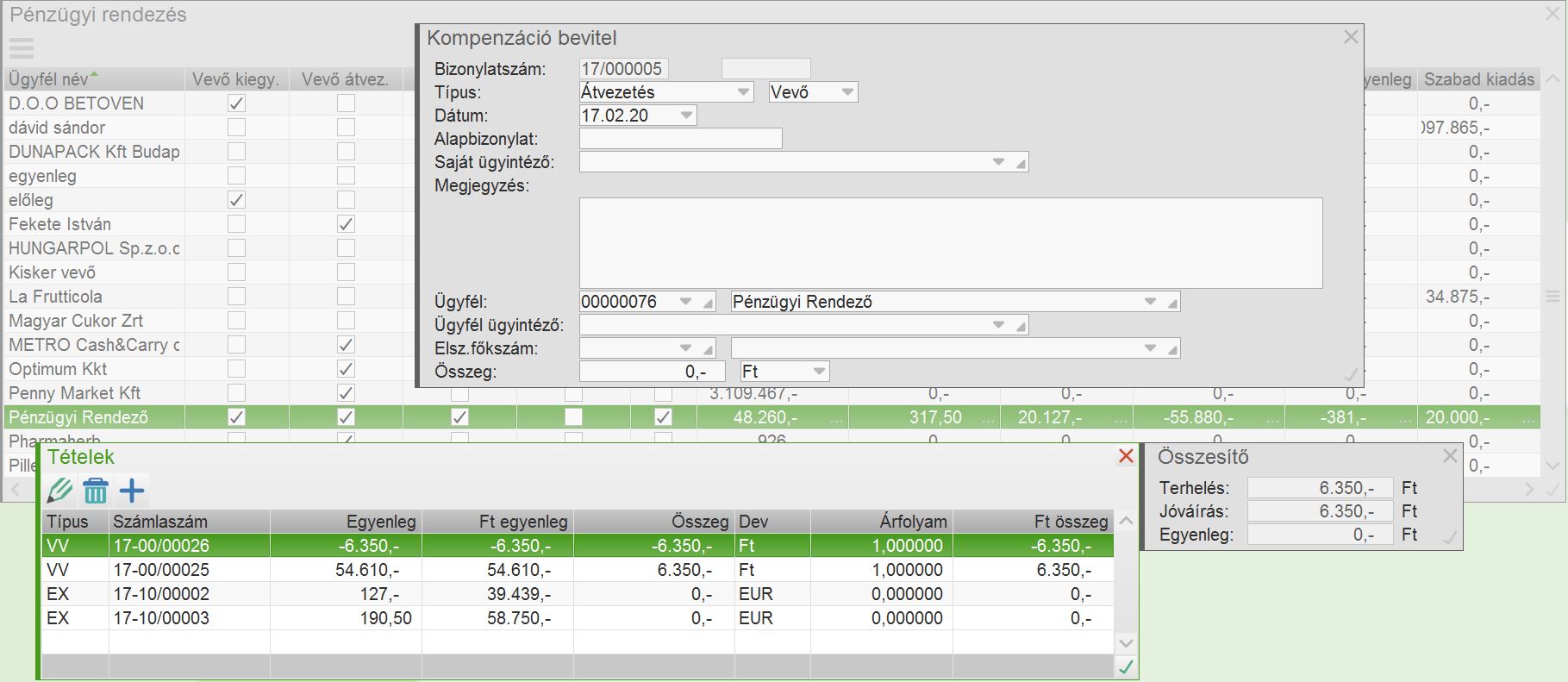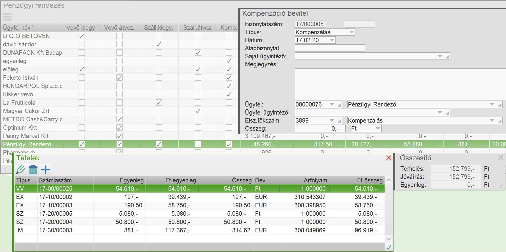 Elméletünk szerint érdemes először a szabad fizetéseket számlákkal összepontozni, majd a szállító vagy vevő oldani átvezetéseket végrehajtani, majd ezután ami maradt, azt érdemes kompenzálni.