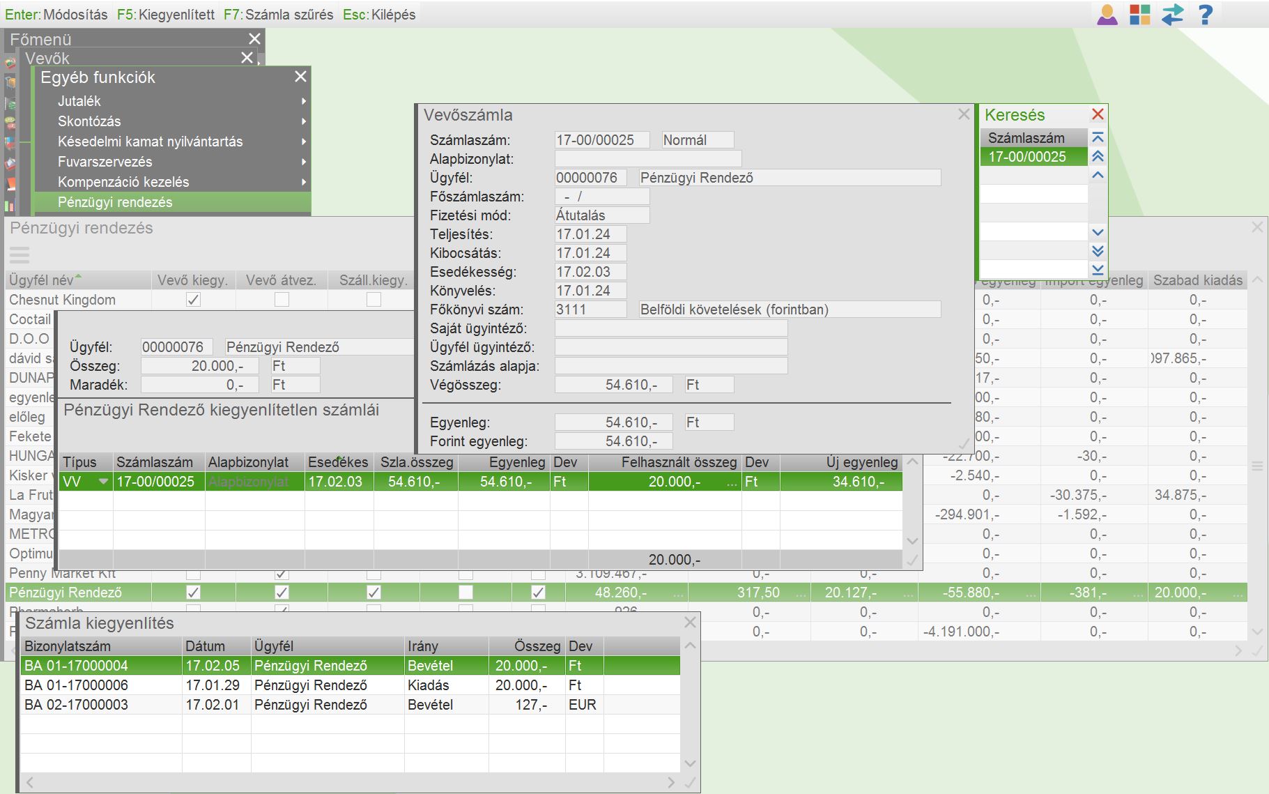 A funkció célja az ügyfelek kiegyenlítetlen számláinak, ill. szabad fizetéseinek egyeztetése.