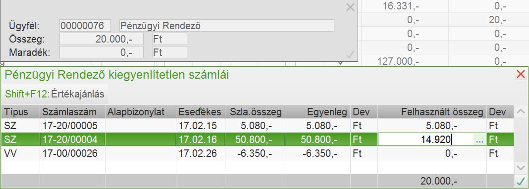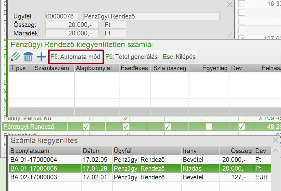 A másik lehetőség, hogy a programra bízzuk, mely számlákat egyenlítsen ki a választott összeggel. A kiegyenlítés kiválasztása után egy ESC-kel megkapjuk az F5:Automata módot,