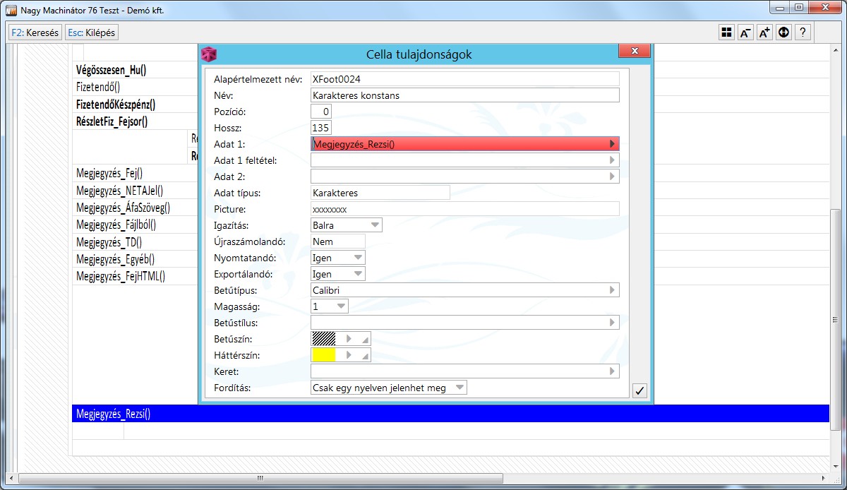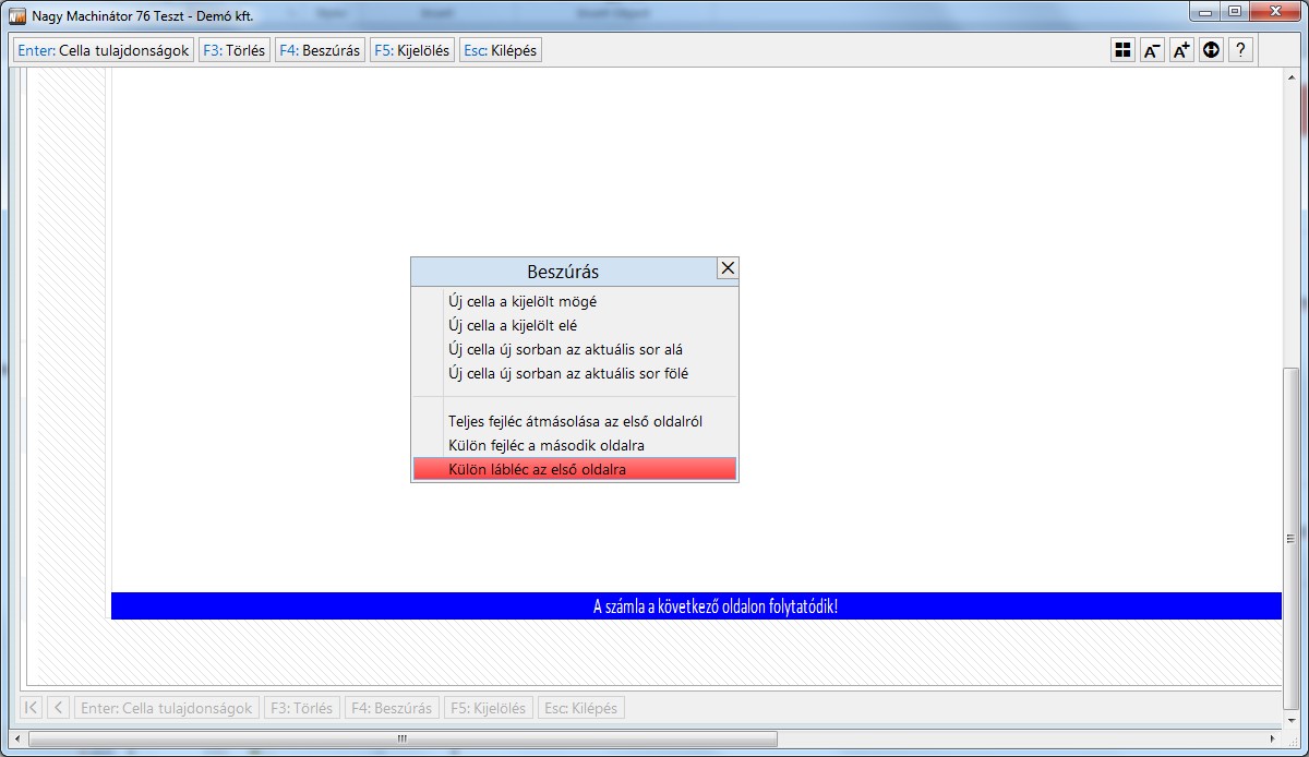 A ProgEn által definiált forma másolása után az első oldal Lábléc blokkjának (Lábléc - Utolsó oldalig) mezőjét kell átállítani az F4: Külön lábléc az első oldalra funkciógomb megnyomásával.