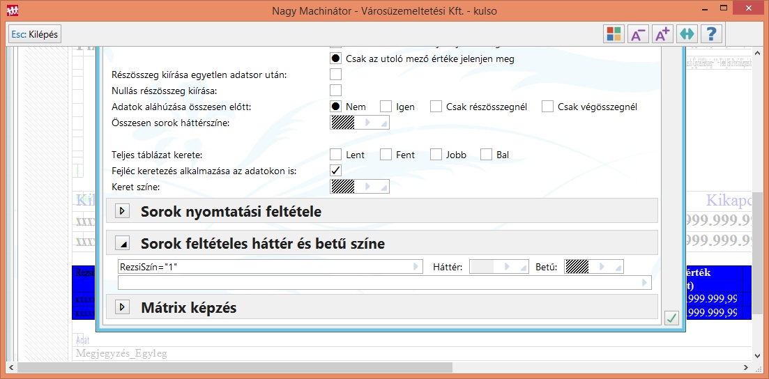 Az egységes számlaképben a "Bruttó számlaérték összesen" és "Fizetendő" soroknak kiemelt háttérszínnel kell szerepelniük. Ennek eléréshez a következő feltételt kell megadnunk a táblázat tulajdonságaiban:
