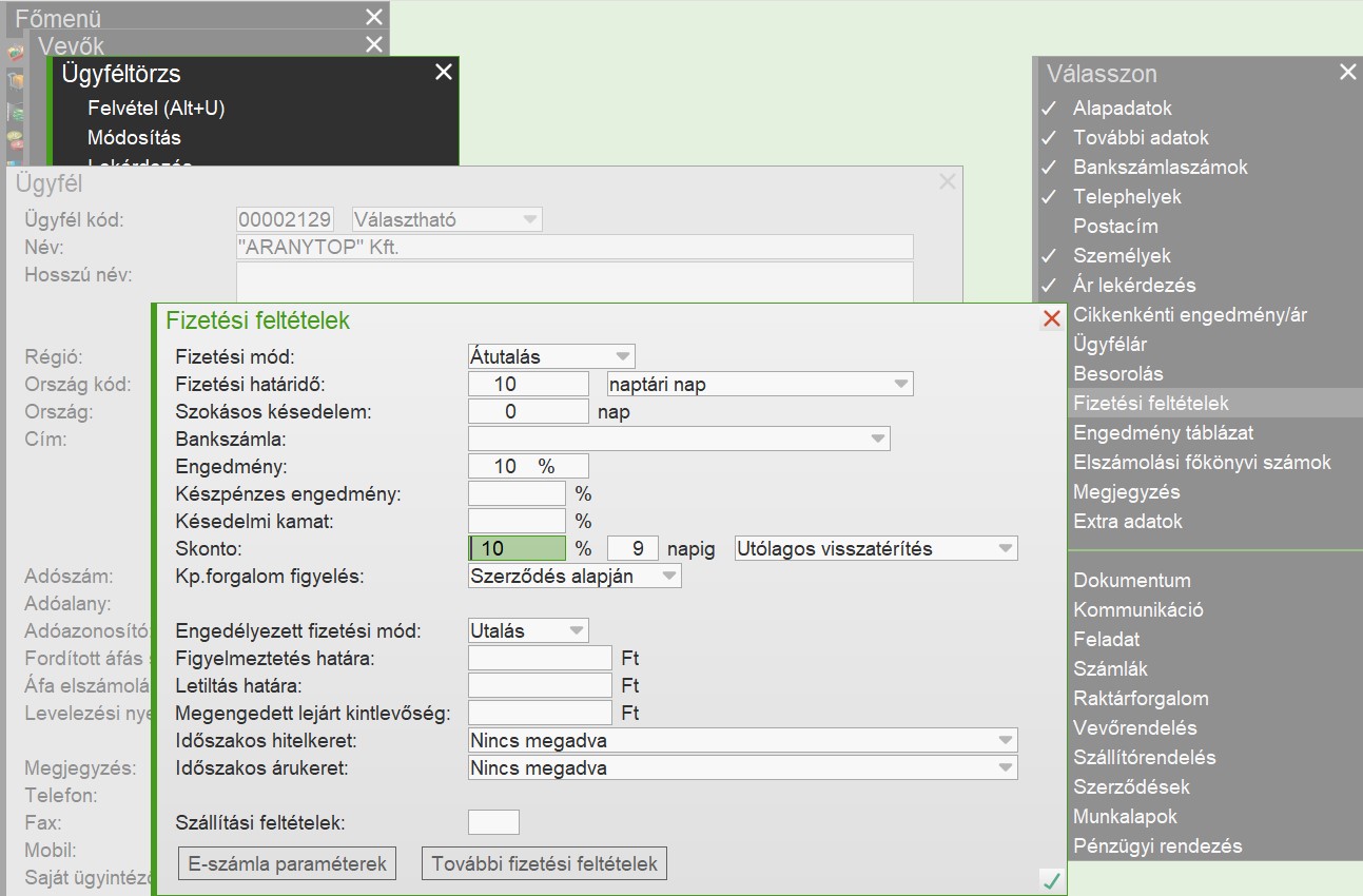 Bizonylatrögzítés megkönnyítésére a skontó százalékot, valamint a fizetési határnapot meg lehet ajánltatni. Az ajánláshoz skontó százalékot és határidő napot meg lehet adni a számlaparaméterekben és az Ügyféltörzs/Fizetési feltételekben.