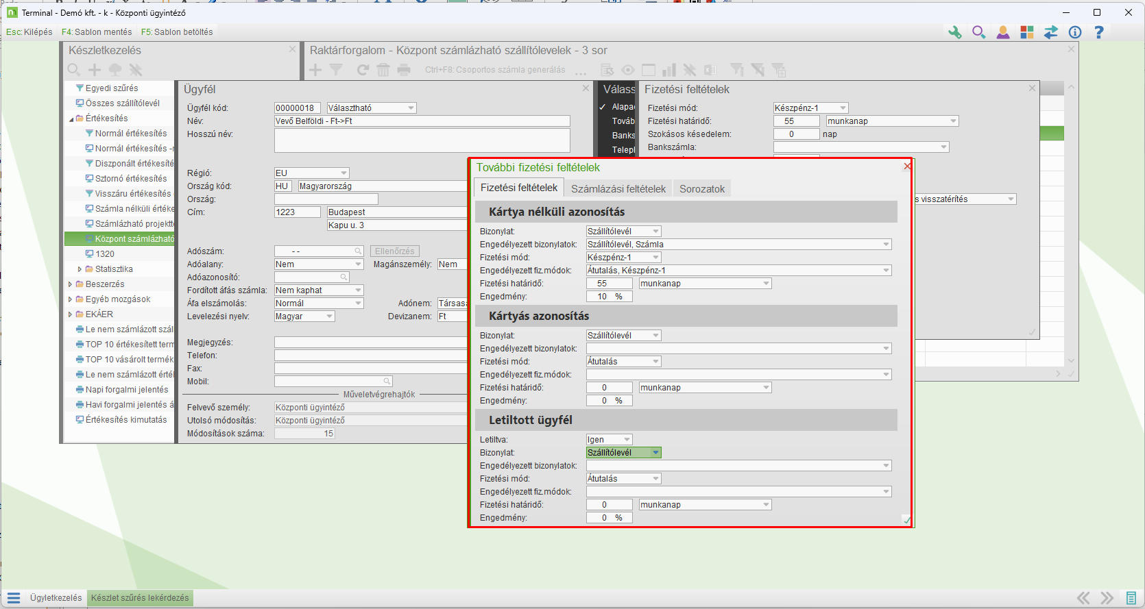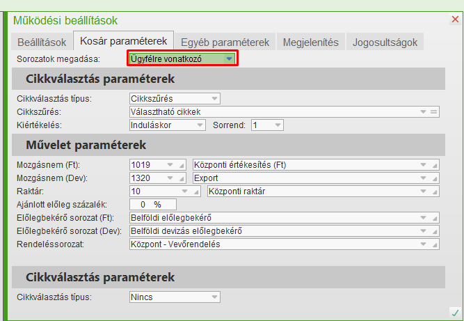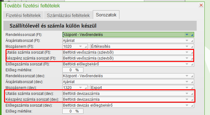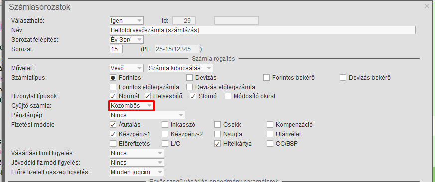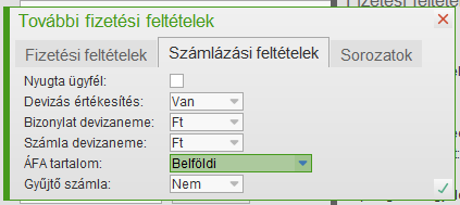 RendelésbőlEzt a értéket akkor érdemes mindenképpen használni, ha a Vásárlóazonosítás utáni fizetési feltételek kezelése topicban leírtak szeritn lett a Kosár funkcióban a rendelés elkészítve. Fizetési mód és határidőA rendelés fejlécében megadott fizetési feltételeket fogja használni a program. A rendelés készítése során az ügyfélazonosítás módjától függően került meghatározásra.-> Bővebben SzámlasorozatEltárolt sorozat A számlasorozatot a vevőrendelés tételben eltárolt sorozat alapján határozza meg a program. A számlasorozatot a Kosár funkcióban rögzített rendelések esetén tárolja el a program. Az eltárolt érték attól függhet, hogy lett-e kérve, hogy a számlasorozatot az ügyféltörzs alapján határozza meg a program. Nincs eltárolt sorozat Amennyiben a rendelés nincs eltárolva érték (VevőRTétel.SzlaParId=0), akkor automatikusan az Ügyféltörzsben megadott számlasorozatot fogja elővenni a program. Az ügyféltörzsből a fizetési módtól és számlafizetés devizanemétől függően fogja meghatározni. Sorozat és az áfatartalom összehangolásaA számlasorozatokban lehet engedélyezni a lehetséges áfatartalmakat. Fontos arra figyelmet fordítani, hogy a számlasorozatban engedélyezve legyen minden vonatkozó áfatartalom. Sorozat és a gyűjtőszámla összehangolásaA számlasorozatokban lehet engedélyezni, hogy lehetséges-e vele gyűjtőszámlát kiállítani. Fontos arra figyelmet fordítani, hogy a számlasorozatban engedélyezve legyen a gyűjtőszámla kiállítása. Alap / Kátyás / LetiltottFizetési mód és határidőVálasztani lehet, hogy az ügyféltörzsben megadható Fizetési feltétel csoportok melyikéből legyen meghatározva a számla fizetési módja, határideje.