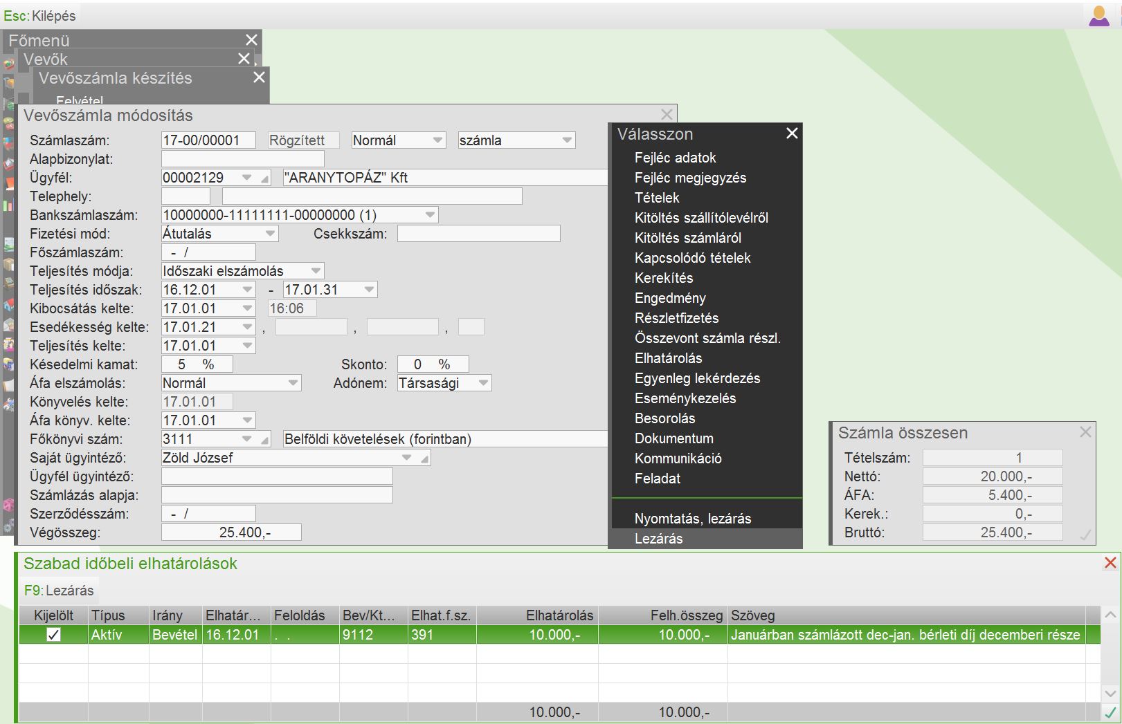 A funkcióval főkönyvi elhatárolás készíthető a számla tételeire vonatkozóan. Az elhatárolást felvehetjük manuálisan vagy generáltathatjuk a programmal.