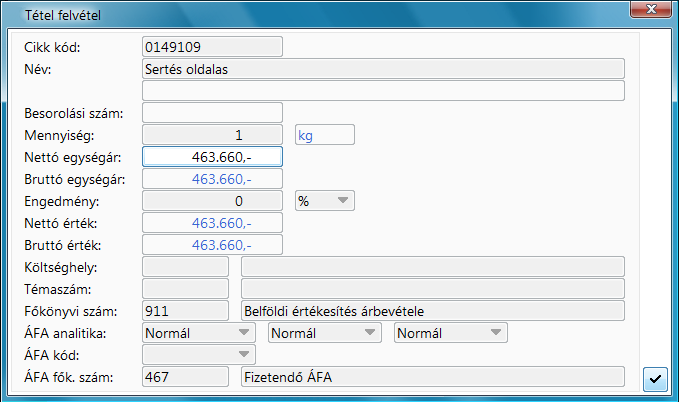 Meg kell még adnunk az Áfa kódot, az Áfa-analitika szerinti besorolást és az Áfa főkönyvi számát. A tétel ezekben a sorokban fog szerepelni az ÁFA bevallásban. Tájékoztató adat. Áfával kapcsolatos egyéb információ: ÁFA Kapcsolódó paraméter: ÁFABontás |