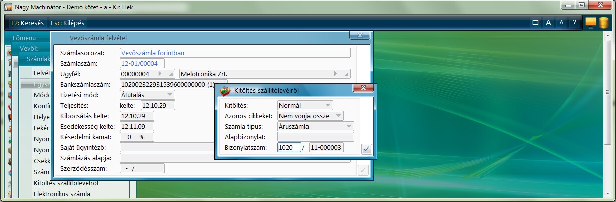 Az Üzemmód = Kitöltés paraméterrel indított akció az adott terminálon az utolsó rögzített szállítólevél ügyfelét és tételeit felhasználva készít számlát. Csak addig működik a kitöltés, amíg a programból nem lépünk ki.