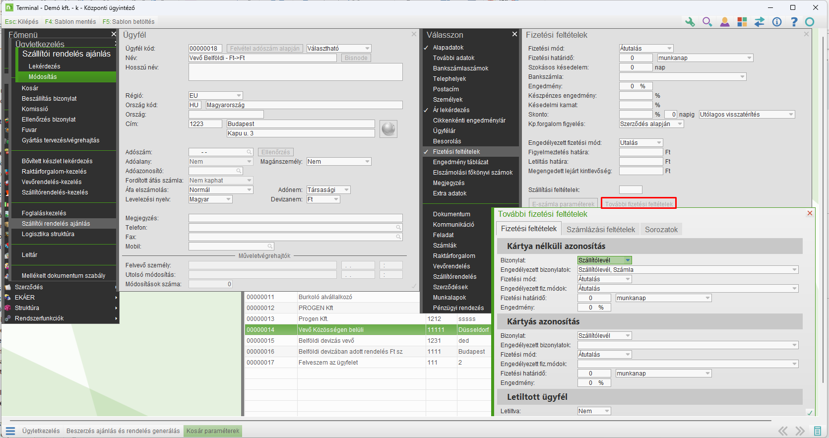 Annak érdekében, hogy a követelményeknek a rendszer megtudjon felelni, programunkban az ügyféltörzsben számos lehetőség van a számlázási és fizetési feltételek meghatározására, ezzel biztosítva a megfelelő számla kiállítását.