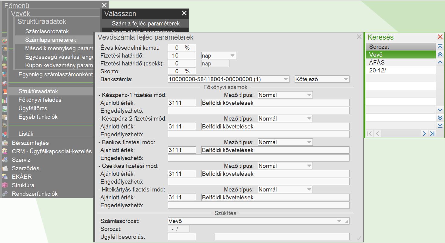 Számla felvételkor a program felkínálja az itt megadott értékeket: főkönyvi számokat, költséghelyeket, témaszámokat, éves késedelmi kamatot, fizetési határidőt és készpénzes engedményt, illetve a megjegyzéseket.
