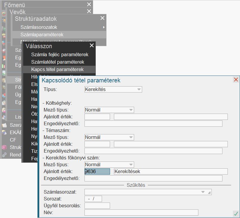 Amennyiben könyveljük a számlákat, javasolt a művelet elindítása előtt leellenőrizni, ki van-e kontírozva a Kerekítés kapcsolódó tétel a Számlaparaméterek/Kapcsolódó tételek akcióban: