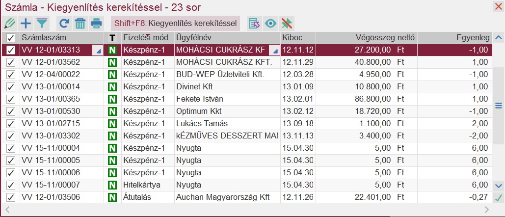 Az eredményablak fejlécében SHIFT+F8: Kiegyenlítés kerekítéssel gombbal futtathatjuk a definiált műveletet.
