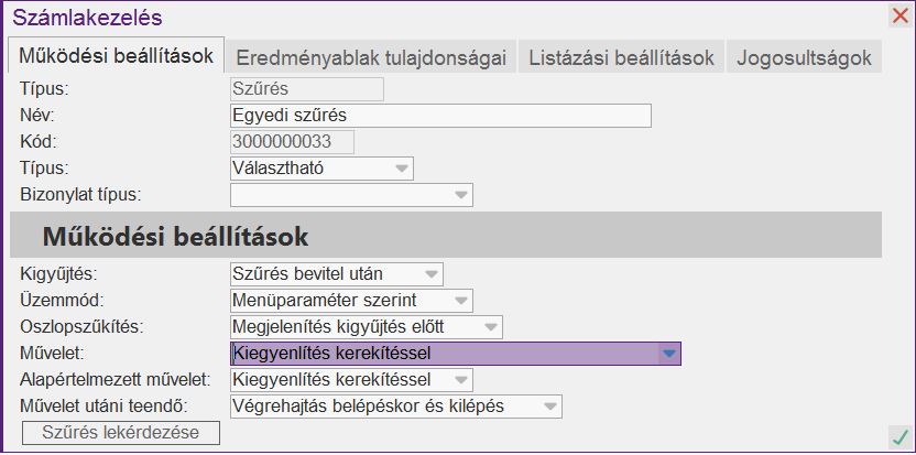A használt szűrésváltozatba be kell állítani, hogy használja a "Kiegyenlítés kerekítéssel" műveletet. Ha a szűrésfa műveletekben beállítjuk az Alapértelmezett műveletnél is ezt, és a Művelet utáni teendőnél a Végrehajtás belépéskor és kilépés opciót, létrehozhatunk egy olyan szűrést, ami a szűrt számlákra manuális beavatkozás nélkül végrehajtja a kapcsolódó tétel generálást.