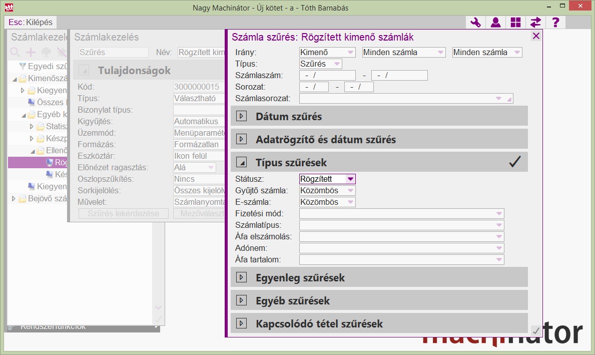 A számlakezelés funkcióban kell egy menüpontot létrehozni és a képenlátható szűrési tulajdonságokat kell beállítani.