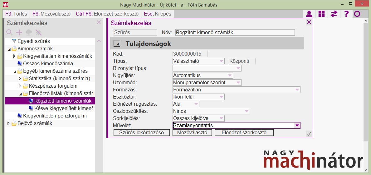Ezenkívül a Szűrés tuljadonságaiban a Művelet=Számlanyomtatás műveletet kell kiválasztani.