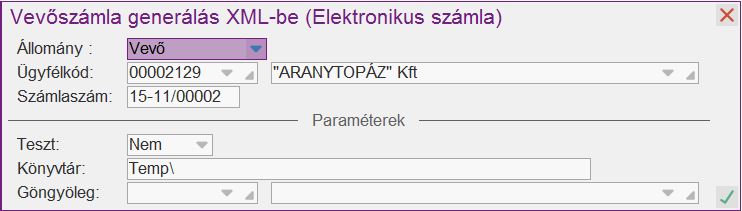 Lehetőség van az automatikus generálásra is, ha egy számla elkészül a programban akkor automatikusan elkészül az e-számla is. Ebben az esetben a Vevőszámla generálás funkcióban (VV_SZG) az ElektronSzla paramétert kell beállítani.