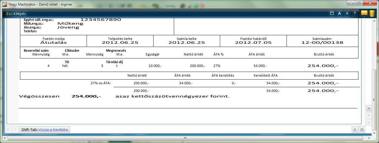 Amennyiben a Paraméterek ki van töltve, a számla képe automatikusan megváltozik (hagyományos formázású lista esetében). Ha van a számlán második mennyiséges cikk, ha nincs két mennyiség jelenik meg a számlatételben, és eltűnik (hely hiányában) a kedvezmény oszlop. Amennyiben tartalmaz engedményt a számla, az engedmény mértékét külön sorba nyomtatja a program.