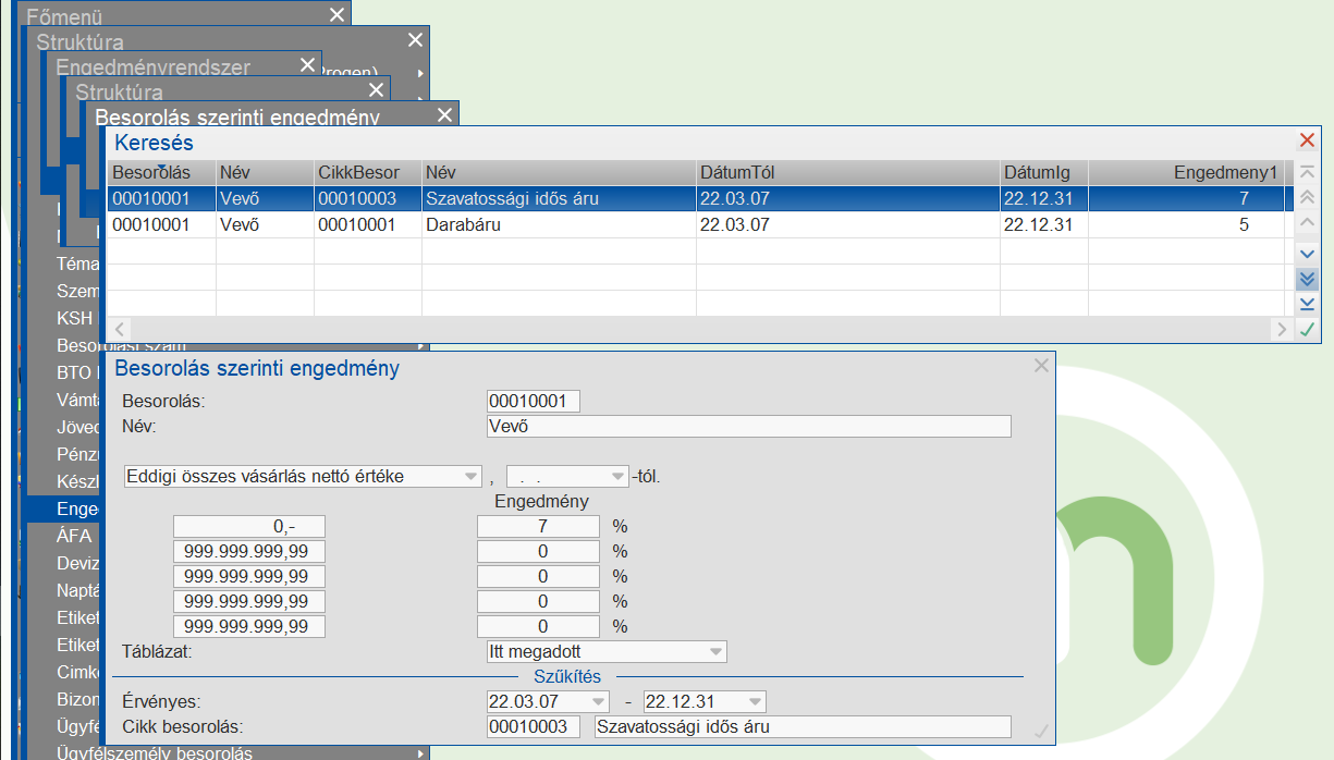Minden besoroláshoz megadhatunk öt sávot aminek elérésekor a megadott engedményt kapja a vevő. Egy besorolás felvehető több különböző cikkcsoport szűkítéssel, és egyszer szűkítés nélkül. A számításkor a számlázás kiszámolja, hogy a Vevő modulban az ügyfélnek mennyi számlája van eddig nettó értékben, az engedmények figyelembe vétele nélkül. A számlák a teljesítés dátumával lesznek figyelembe véve. Ha szűkítéseket is vettünk fel akkor a szűkítésben megadott cikkcsoportokra külön is elvégzi az előző számítást a program és attól függően, hogy az eladandó cikk milyen cikkcsoportba tartozik más engedményeket számol ki. Ha szűkítések is vannak akkor a szűkített cikkcsoportok eladásai nem számítanak bele az összes eladásba.