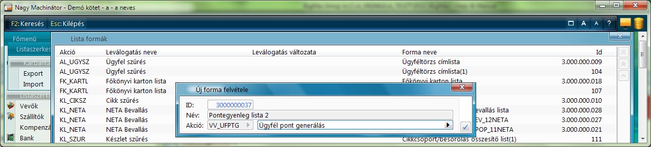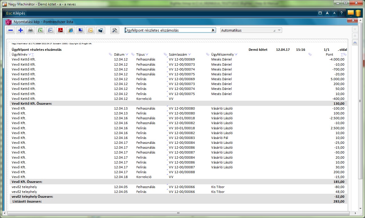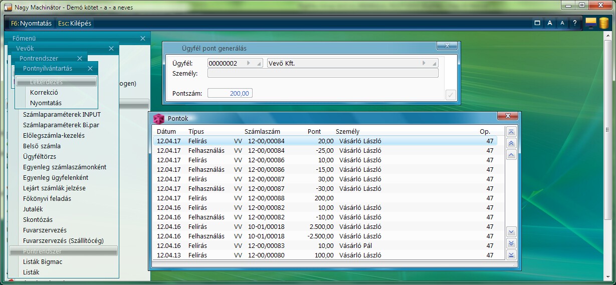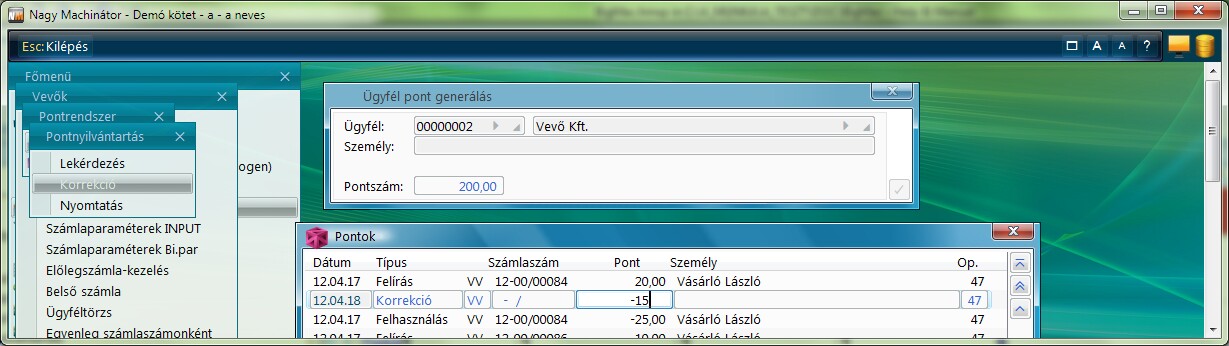 A pontrendszer részeként az ügyfélpont nyilvántartás funkció alkalmas a pontok lekérdezésére, korrigálására, nyomtatására.