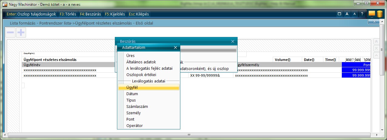 A pontnyilvántartás a következő adatokat adja át a formázónak: Ügyfélkód, Dátum, Típus, Számlaszám, Személy, Pont, Operátor