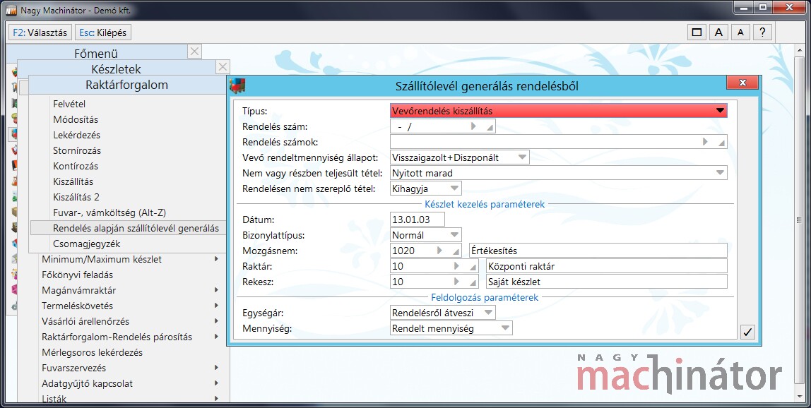A funkció alkalmas közvetlenül szállítólevé generálására is. (Tehát nem kell Rendelés -> Szállítólevél útvonalat bejárni.)