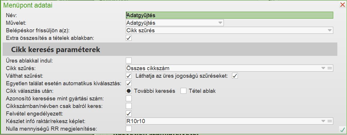Amennyiben a "Cikk választás után" mező értékét Tétel ablakra állítjuk, mennyiséges adatgyűjtést használhatunk, mivel a cikk megtalálása után a tétel ablakban megadhatjuk a mennyiséget, míg Tovább keresés érték esetén a megtalált cikket egy mennyiséggel teszi a program a kosárba, azaz több mennyiségnél többször kell megkeresni.