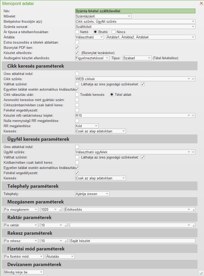 A funkció készletkezeléssel együttes számlakészítésre alkalmas. Tulajdonképpen értékesítés szállítólevél készül, mely elkészülte után a fizetési mód megadható és így a számla is elkészül.