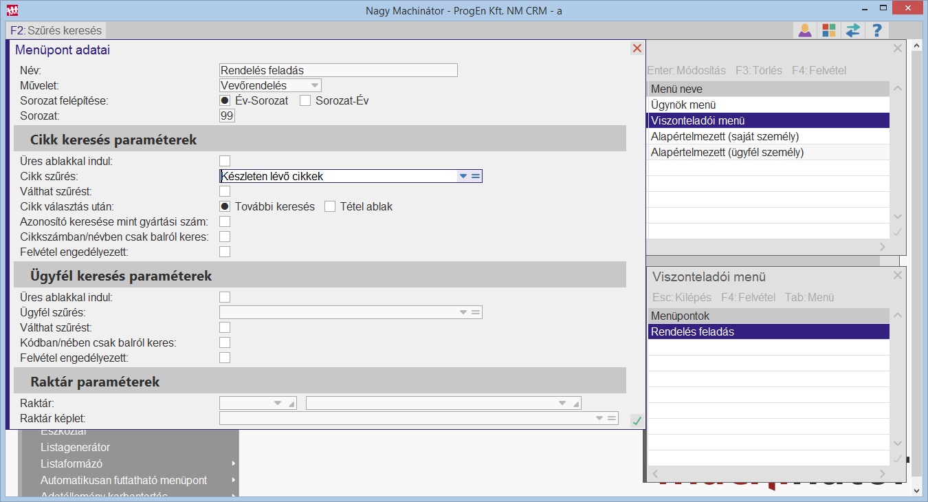 Ehhez a Menü gombot kell megnyomnunk és először felvenni a viszonteladói menü fejlécét. A menü nevén túl egy ügyfél-szűrést érdemes megadnunk, mivel ez határozza meg, hogy a viszonteladók mindig ezt a menüt lássák belépés után.
