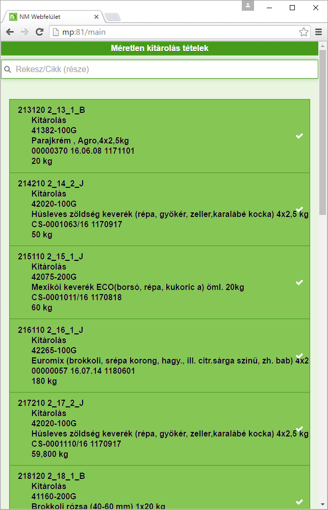 A bele írt/beolvasott adat lehet: 1. Cikk vonalkód/cikkszám: A listát leszűkíti az adott cikkre. 2. Rekesz kód: A listát leszűkíti az adott rekeszre. 3. Bármi más esetén azok az elemek maradnak a listában, amikben megtalálható a keresett szöveg. |