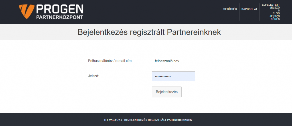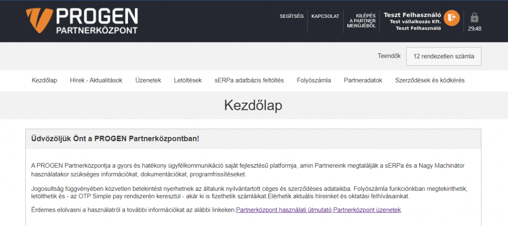 - Partneradatok: Cégük székhely és telephely adatainak áttekintésére szolgál, illetve innen kezdeményezhető az adatok módosítása is. Biztonsági okokból a Partner által módosított adatok nem kerülnek rögtön átírásra az adatbázisban, ehhez a Progen adminisztráció jóváhagyása is szükséges a rendszerben. Az adatmódosítások átvezetéséről emailben tájékoztatjuk tisztelt Partnereinket.