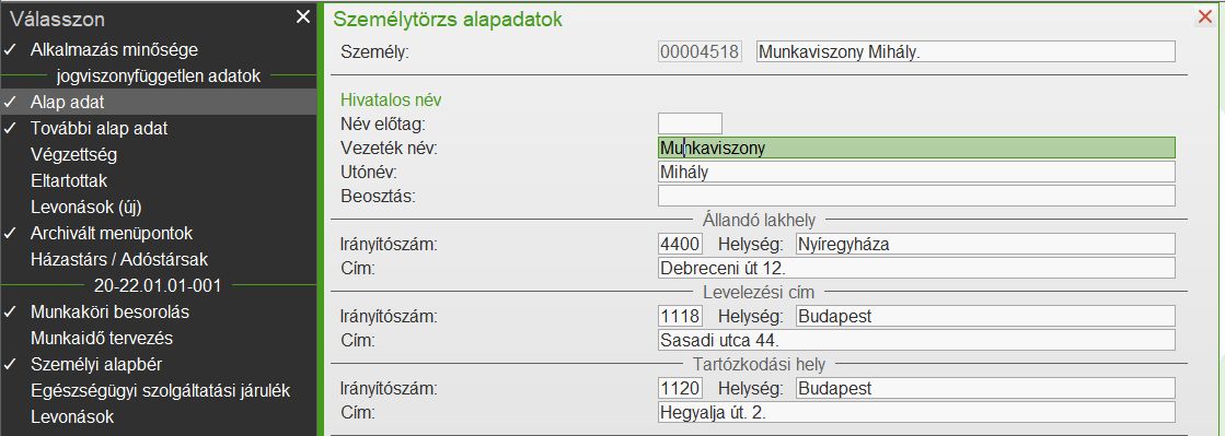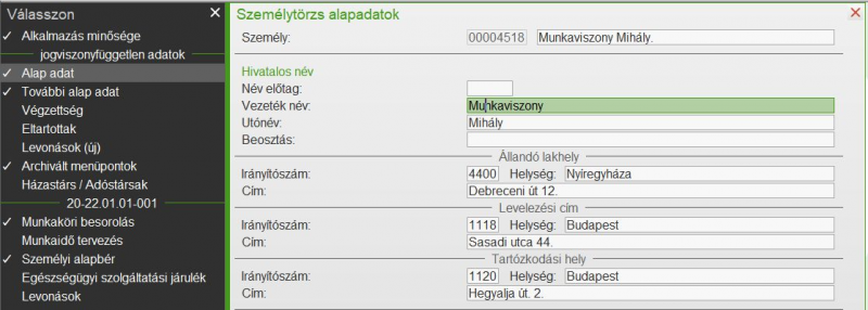 A verziótól kezdődően lehetőség van a Személytörzs / Alapadatok ablakban az állandó lakhelyen kívül megadni a levelezési címet és a tartózkodási helyet. A megadott adatok lekérdezhetőek a Bérszámfejtés szűrésben, valamint nyomtatásra kerülnek a Foglalkoztató igazolásra, a Munkaügyi karton listákra és az Munkanélküli járadék igényléséhez szükséges igazolásra is.